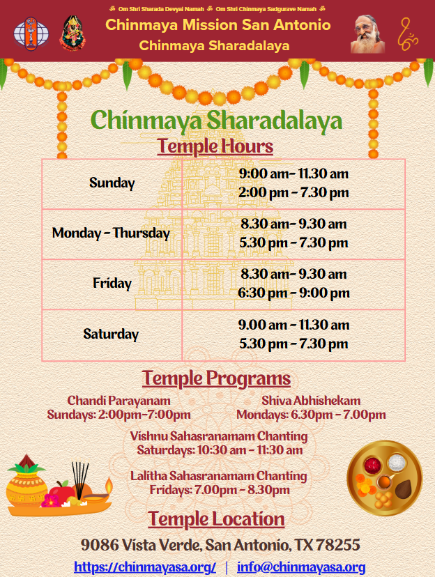 Goddess Sharadamba and Sri Satyanarayana are the presiding deities of the temple at the Chinmaya Mission of San Antonio, . It was established in 1984 as the original Hindu temple and over the years has been lovingly referred to as the Mother Temple of San Antonio. This temple which has been visited by a number of prominent spiritual leaders and devotees has a very blessed and rich history.